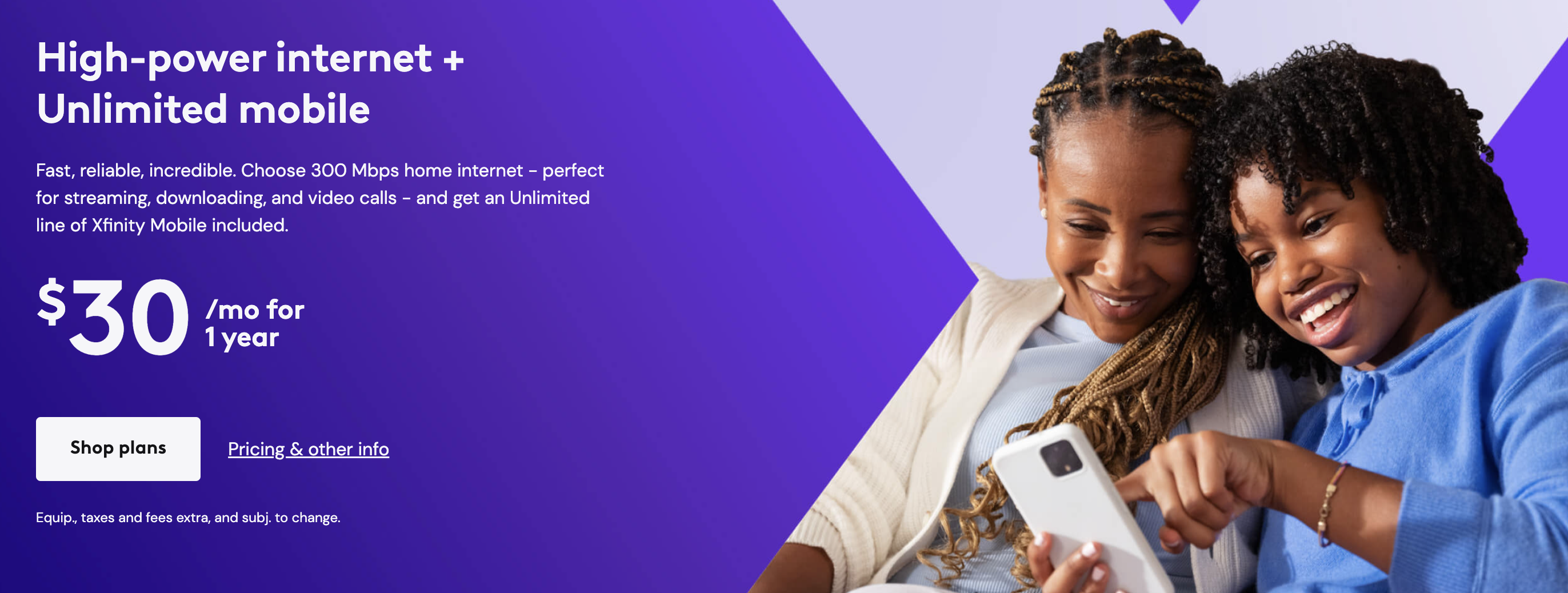 Xfinity is currently running a promotion in the internet deals section of its website for 300 Mbps home internet for $30 a month for a year. This is well below the average monthly cost for home internet. And Xfinity sweetens the deal by throwing in an “unlimited” mobile line for free.