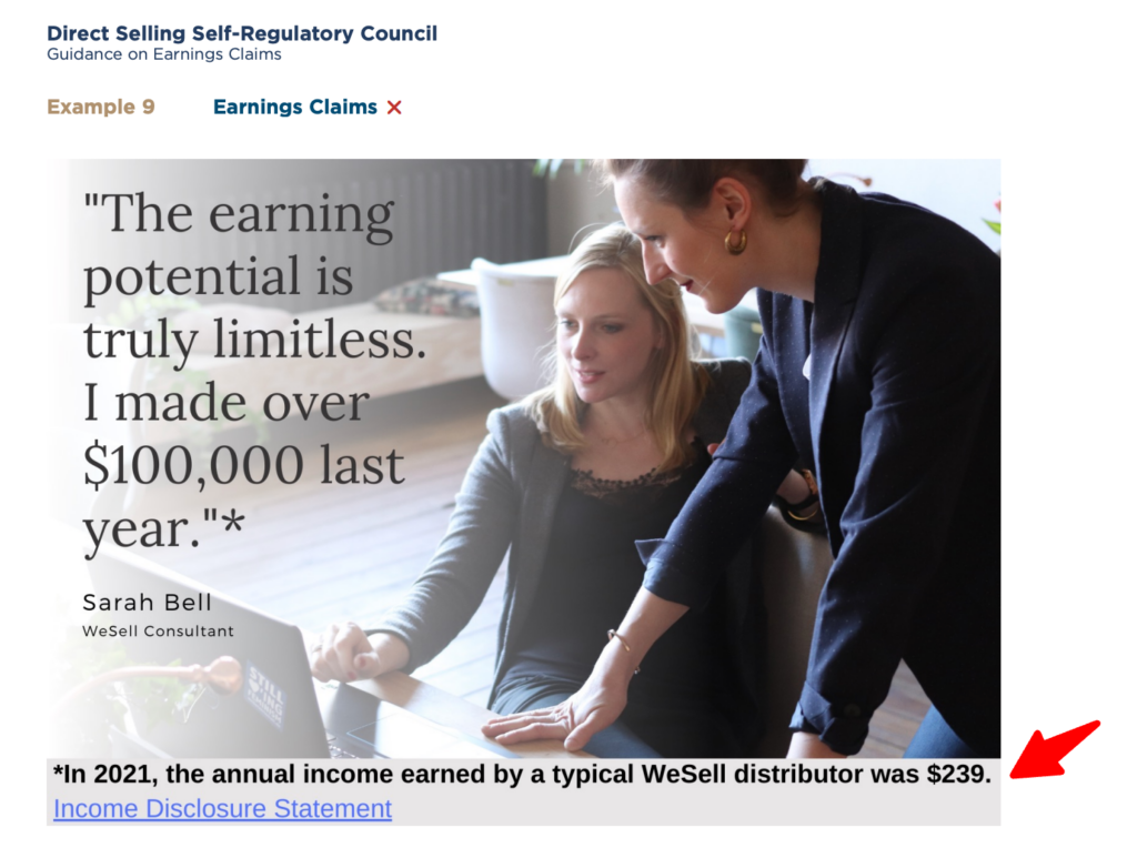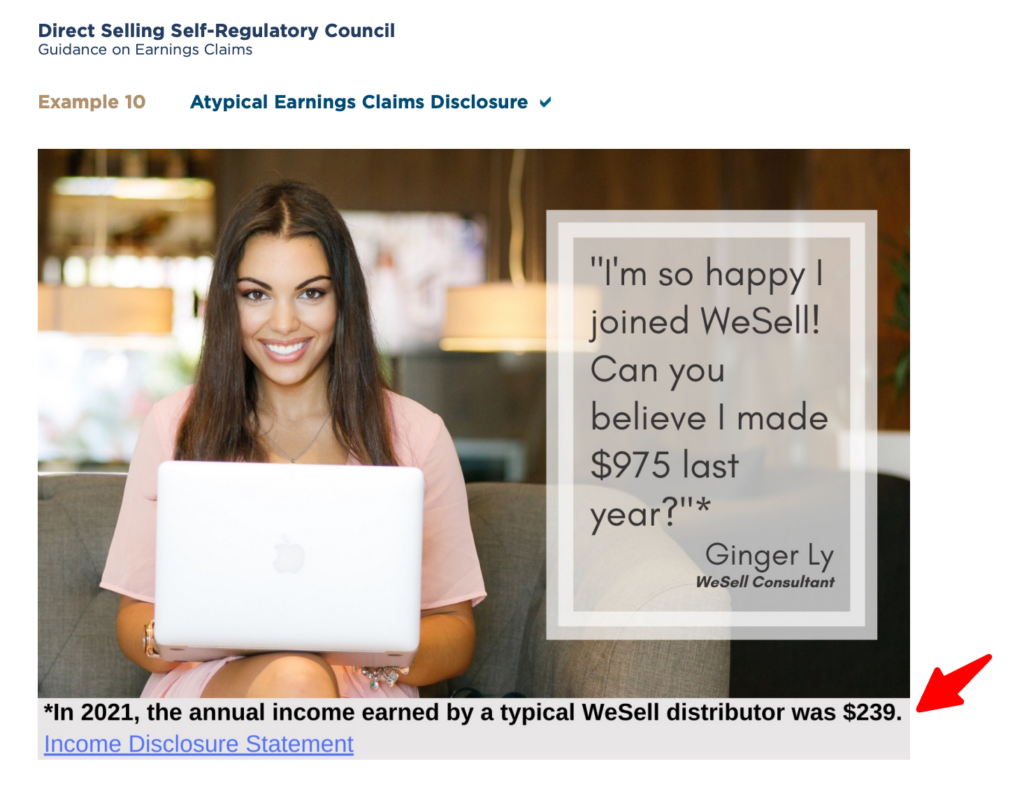 The DSSRC guidance doesn’t just say, “add a disclaimer.” Using a number of examples, the self-regulatory body repeatedly shows MLMs what it expects in a disclaimer statement: a short statement of typical annual income, placed below the claim in clear, bold type, set against a contrasting background color.