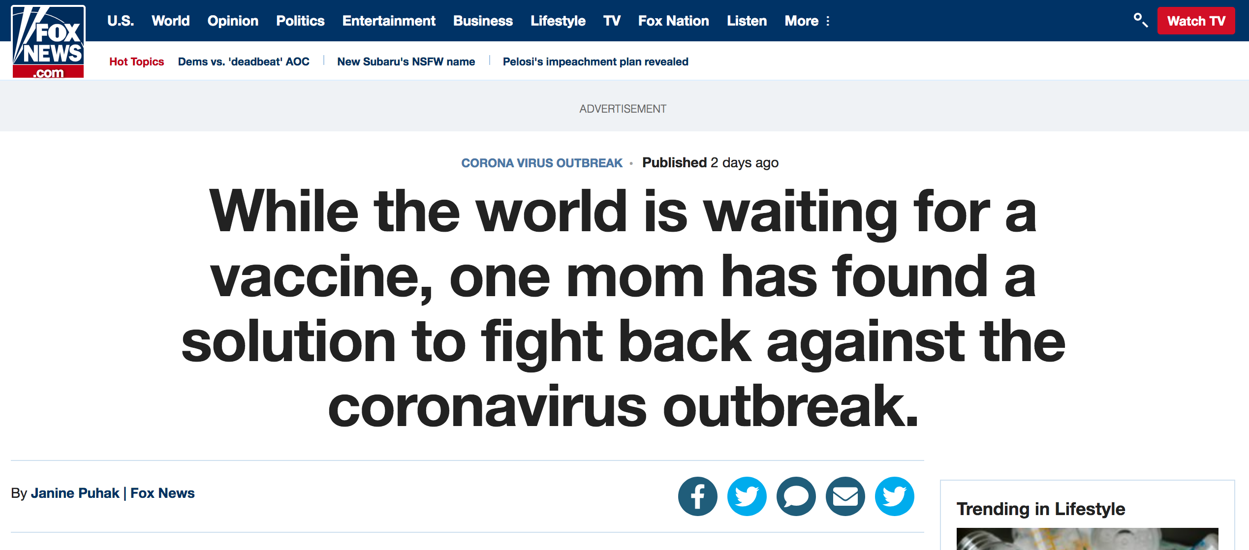 The latest coronavirus scam to land on TINA.org’s radar, sent in by a reader yesterday, comes packaged as a fake Fox News article with the headline, “While the world is waiting for a vaccine, one mom has found a solution to fight back against the coronavirus outbreak.”