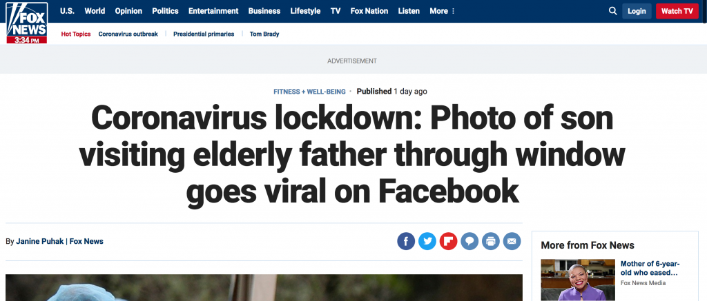 The fake site on which the fake article appears bears an uncanny resemblance to the actual conservative-leaning news site, seen below, except that every section (“U.S.,” “World,” “Opinion,” and so on) links to an order page for Pure Herbal Total Defense Immunity Blend, an essential oils blend and the mother of two’s answer to the coronavirus. Even the byline, Janine Puhak, who is an actual editor at Fox News, is the same as on an article published March 17 on the real Fox News site.